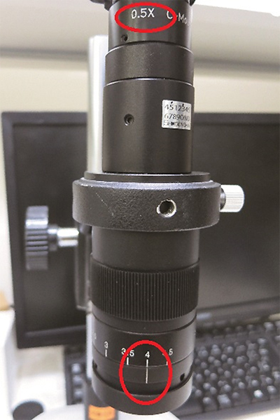 หากคุณติดกล้องขนาด 1/2 นิ้วเข้ากับเลนส์ที่มีกระบอกเลนส์ 0.5x (เลนส์ซูม SDS-M) ดังที่แสดงในภาพด้านบน และสังเกตบนจอภาพขนาด 17 นิ้ว
