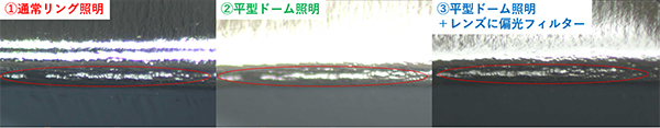 แสงทรงโดมแบนนี้เหมาะสำหรับการตรวจจับข้อบกพร่องในผลิตภัณฑ์ที่มีความโค้ง การตรวจสอบพื้นผิวของผลิตภัณฑ์ที่เป็นโลหะ และตรวจสอบเครื่องหมายบนชิ้นงานที่มีรูปร่างไม่สม่ำเสมอ เช่น พื้นผิวที่ไม่เรียบ แต่ด้วยการใช้ฟิลเตอร์โพลาไรซ์ในเลนส์ ผลกระทบของการบังแสงจะลดลง บางสิ่งสามารถสังเกตได้ชัดเจน