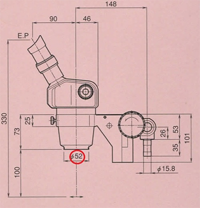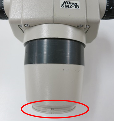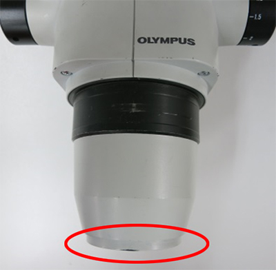 When attaching a general-purpose ring lighting (not a specialized device) to the tip of a stereomicroscope, it can basically be attached if the inner diameter of the ring lighting is larger than the tip of the microscope (red circle in the drawing below).