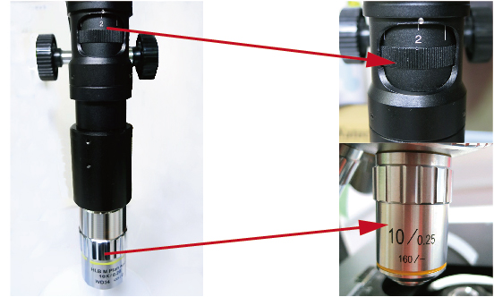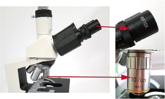 (For the microscope in the photo below, the objective lens magnification is 10x x the eyepiece lens magnification 10x, giving an optical magnification of 100x.)